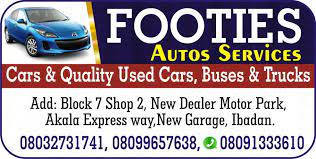 Footies Autos Services Block 7, Shop 2, New motor Dealer Park, Akala expressway, Ibadan, Oyo Nigeria 0803 273 1741, 0809 965 7638 More info Write a Review Footies Autos Services are independent dealers offering sales and aftersales services on quality clean cars, buses and trucks.